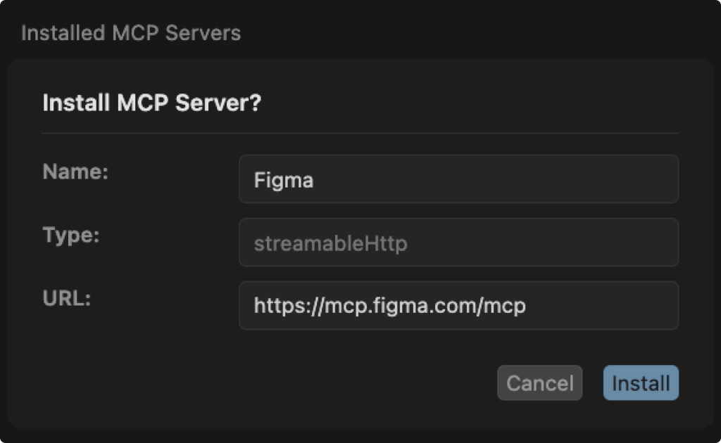 cursor://anysphere.cursor-deeplink/mcp/install?name=Figma&config=eyJ1cmwiOiJodHRwczovL21jcC5maWdtYS5jb20vbWNwIn0%3D - Install